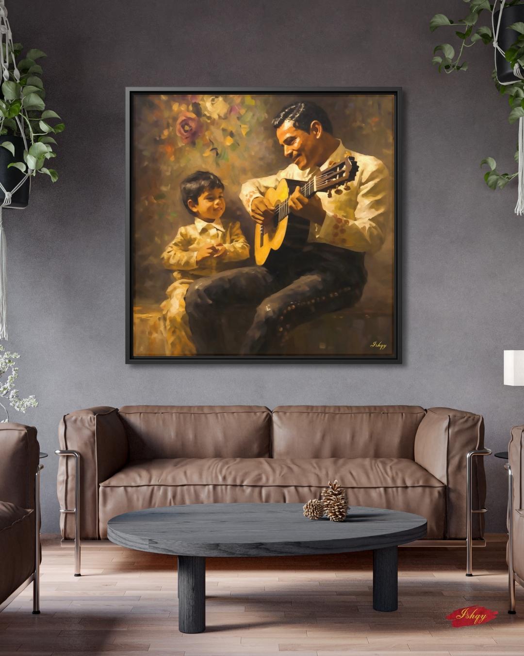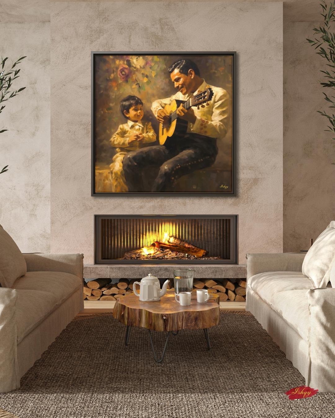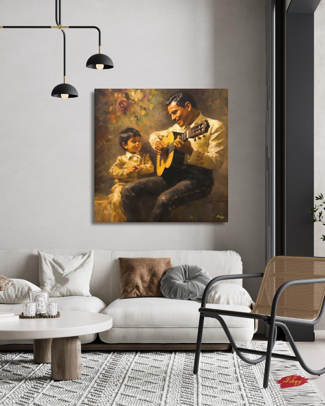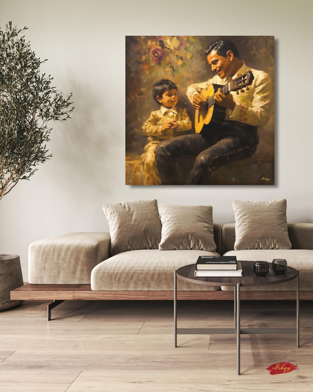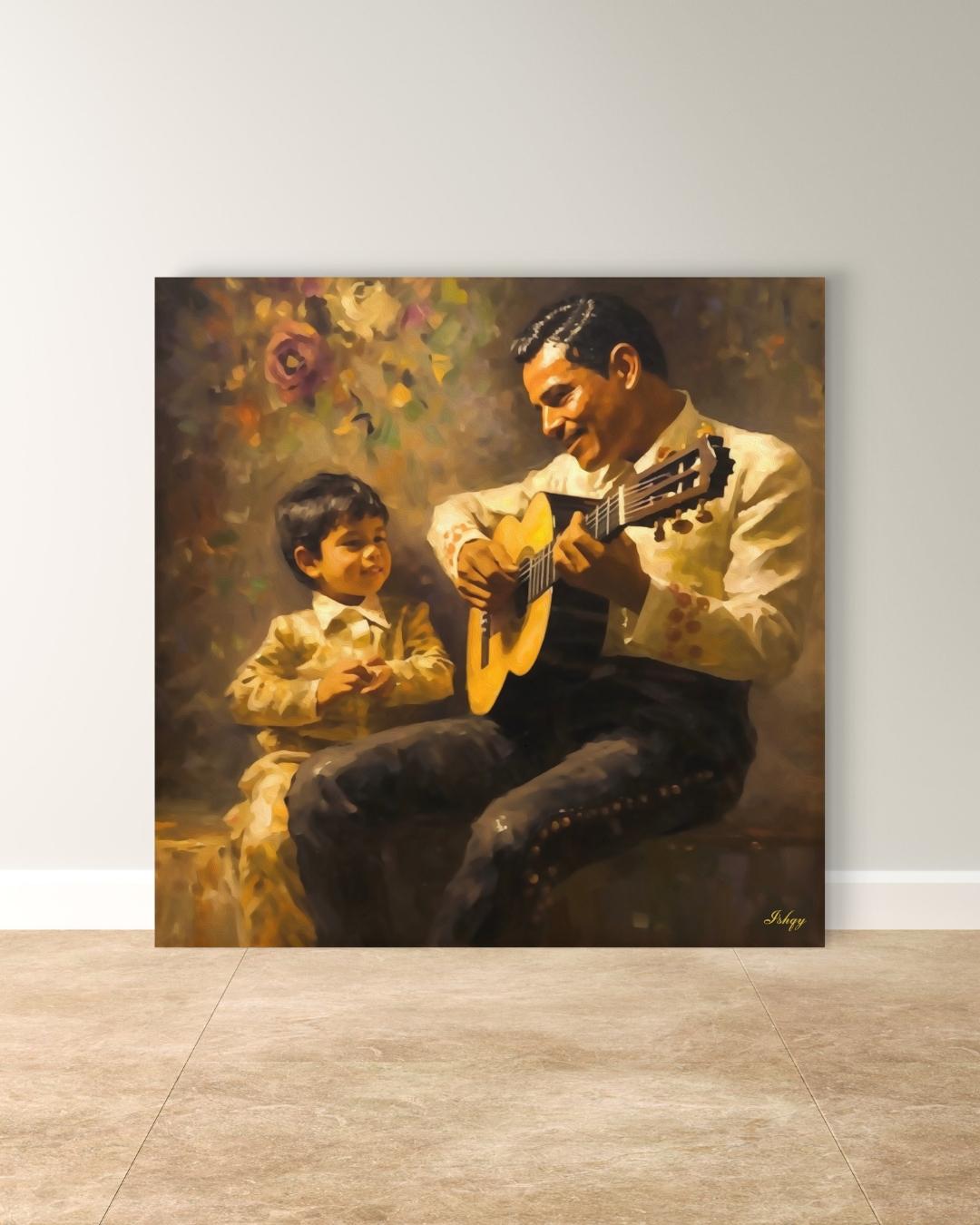 A tender moment between a mariachi father and his young son, this piece celebrates heritage passed from one generation to the next.